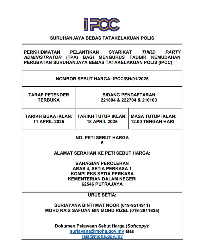 Perkhidmatan Pelantikan Syarikat Third Party Administrator (TPA) Bagi Mengurus Tadbir Kemudahan Perubatan Suruhanjaya Bebas Tatakelakuan Polis (IPCC)