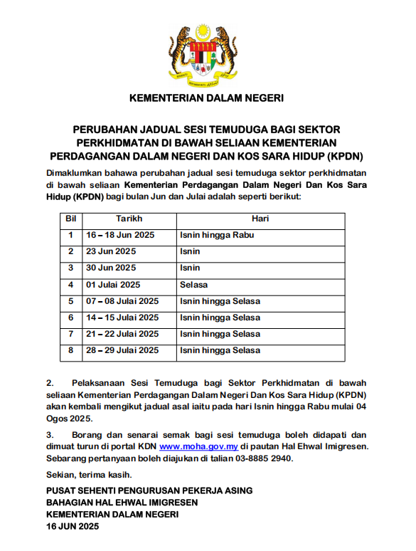 Perubahan Jadual Sesi Temuduga Bagi Sektor Perkhidmatan Di Bawah Seliaan Kementerian Perdagangan Dalam Negeri Dan Kos Sara Hidup (KPDN)
