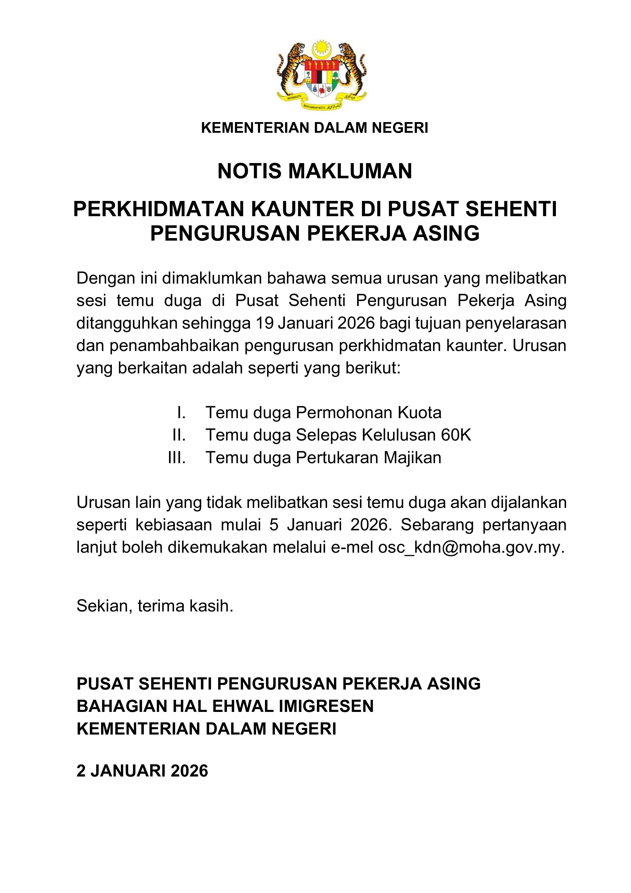 Notis Makluman Perkhidmatan Kaunter di Pusat Sehenti Pengurusan Pekerja Asing
