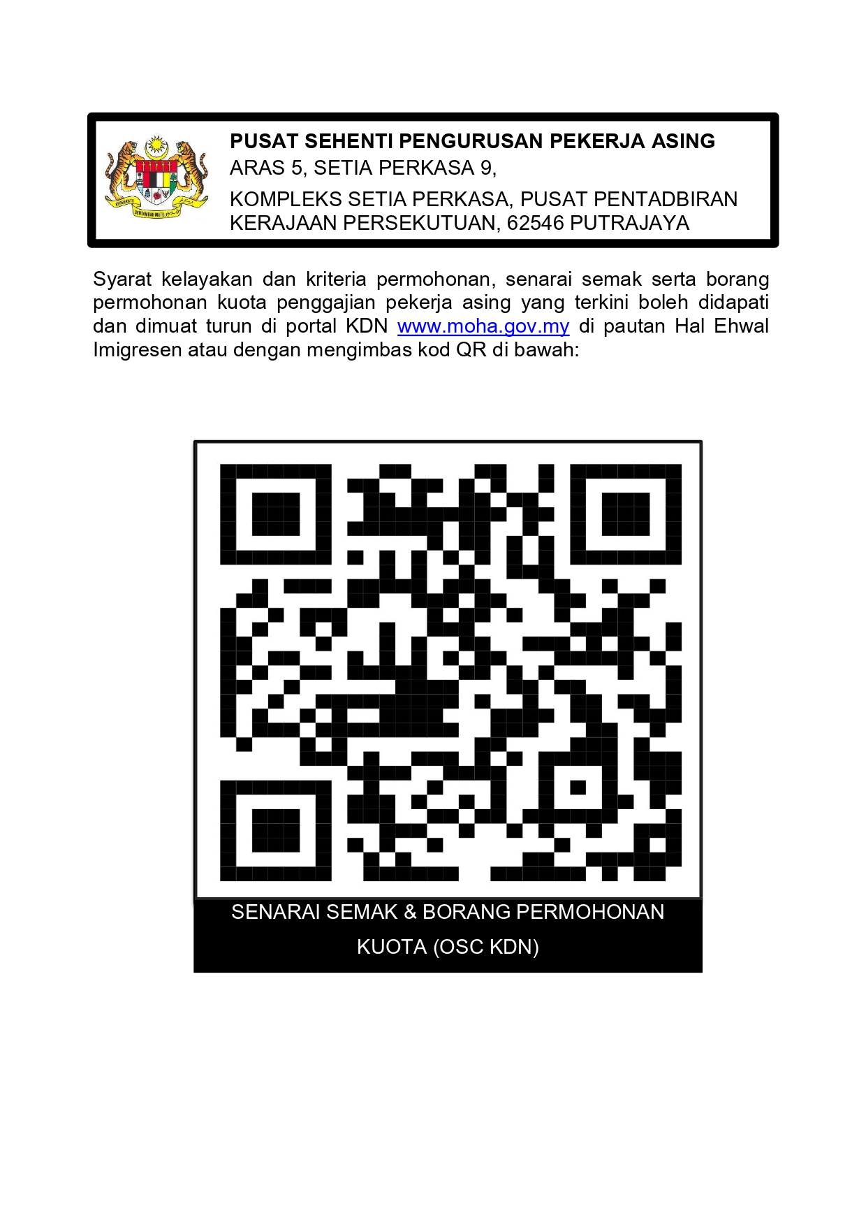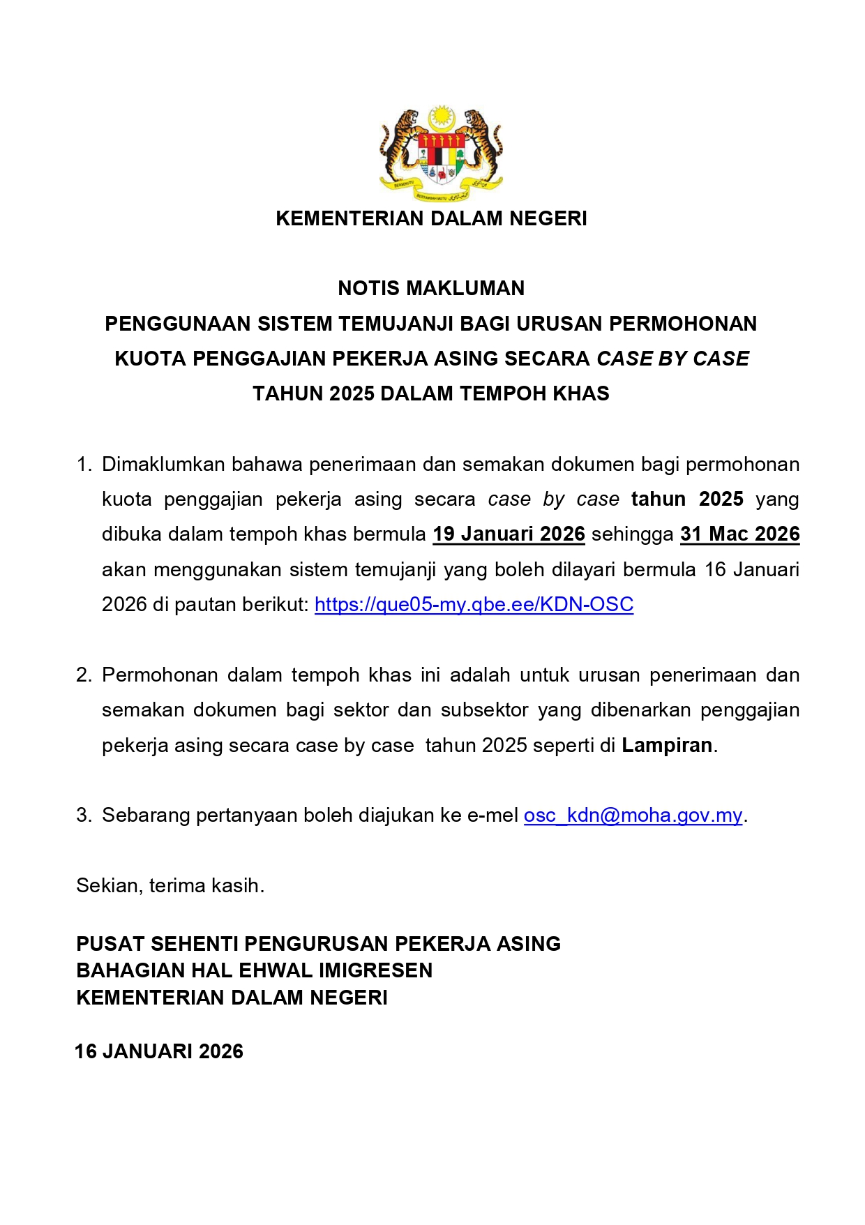 Notis Makluman Pengunaan Sistem Temujanji Bagi Urusan Permohonan Kuota Penggajian Pekerja Asing Secara Case By Case Tahun 2025 Dalam Tempoh Khas